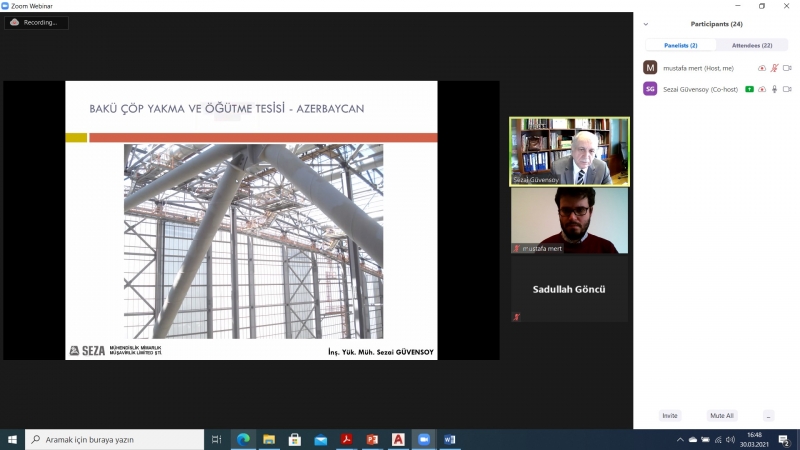Konuşmacı Seza Mühendislik firması Genel Müdürü İnşaat Y. Mühendisi Sezai GÜVENSOY konuşmasına kendisini tanıtarak başladı. Hazırlamış olduğu sunumunda ilk olarak geçmişte yapılan çelik yapı tasarımı ile ilgili hesapları anlattı. 1960'lı ve 1970'li yıllarda elle yapılan hesaplar ile ilgili çeşitli örnekler verdi. Daha sonra günümüze geçerek yeni yönetmelikler üzerinden yapılan hesap detaylarını açıkladı. Her bir çelik eleman üzerinde yapılan tahkikleri örnek vererek anlattı. Çelik sanayi yapıları ile ilgili yönetmeliklerdeki eksikliklerden bahsetti ve bu yapılar ile ilgili yeni yönetmelik üzerinde çalışıldığını belirtti. Ardından değerli öğretim üyelerimiz ve öğrencilerimizden gelen sorulara Sezai Güvensoy tarafından verilen cevaplar ile seminerimiz sona erdi.