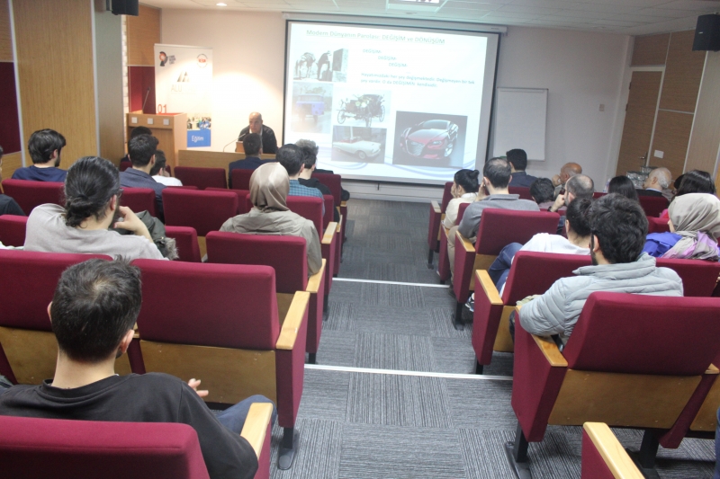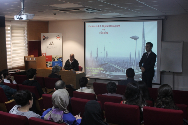 Prof. Dr. Ercan Öztemel’in sunumunda öncelikle dijital dönüşümün ne olduğu üzerinde duruldu. Dünyadaki örneklerinden yola çıkılarak dijital dönüşümün bileşenleri; otonom robotlar, siber güvenlik, bulut teknolojisi, eklemeli üretim, simülasyon, nesnelerin interneti, sistem entegrasyonu ve büyük data analizlerinden bahsedildi. Durum tespiti niteliği taşıyan konferansın ilk bölümünde gelişen teknolojinin avantajları ve dezavantajlarına da değinildi. Dönüşümün enerjisinin bilgi olduğu vurgusu yapılarak Türkiye’de bu alanda süren çalışmalar ile konferansın ikinci bölümü devam etti. Özellikle yapay zekânın geldiği son nokta ve robotlaşma ile gelecekte bizi bekleyen toplumsal değişimlerin katılımcılar tarafından büyük ilgi ile takip edildiği bölümler soru cevap şeklinde devam etti.