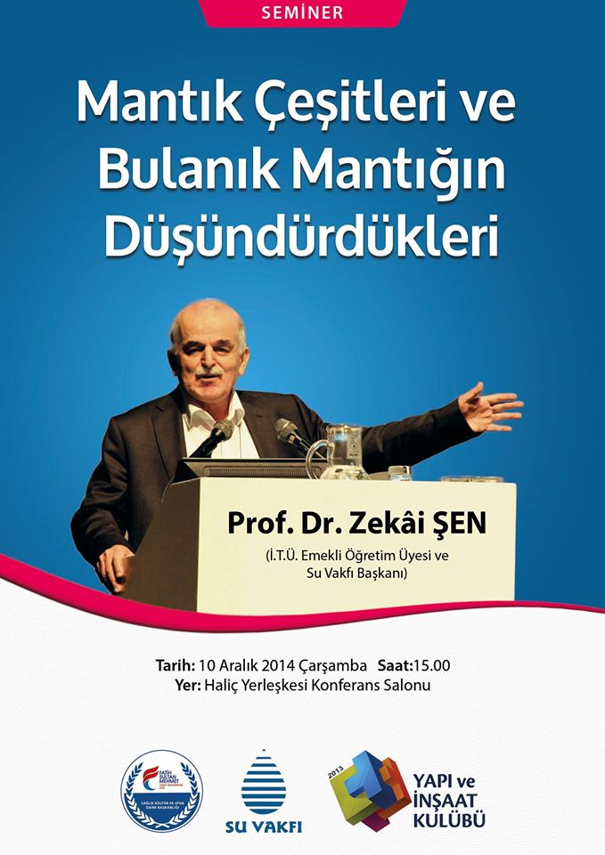 Ülkemizin dünya çapında yetiştirdiği sayılı akademisyenlerden biri olan İTÜ Emekli Öğretim Üyesi ve SU VAKFI Başkanı Prof. Dr. Zekâi ŞEN, ‘Mantık Çeşitleri ve Bulanık Mantığın Düşündürdükleri’ konulu semineri vermek için 10 Aralık 2014 Çarşamba günü saat 15:00’te Haliç Yerleşkesi Konferans Salonunda olacaktır.