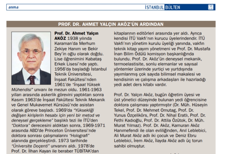 Zekai Celep; “Prof.Dr. Yalçın Aköz’ün ardından” İnşaat Mühendisleri Odası, İstanbul Bülteni, 168, 29-30 ,2021.