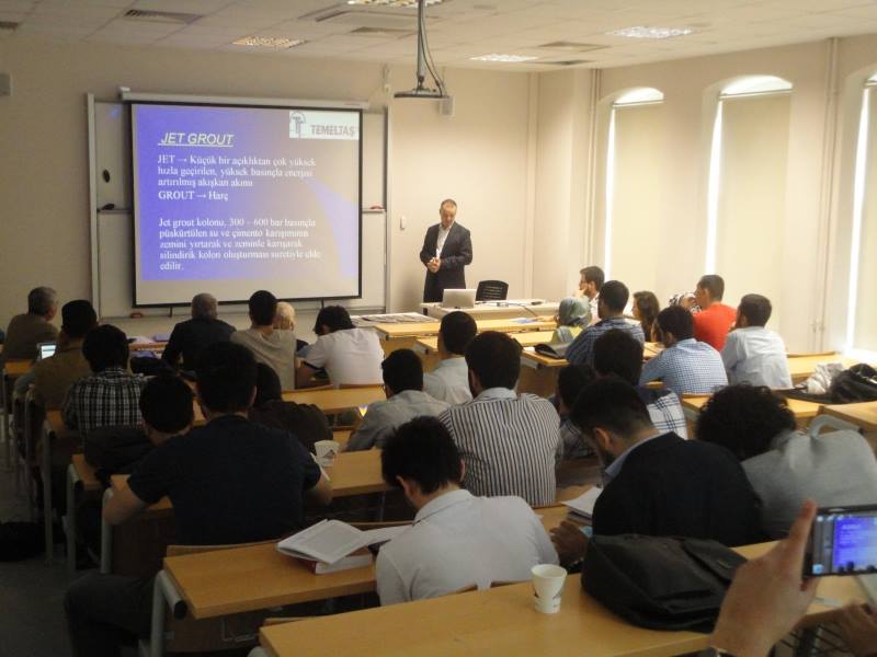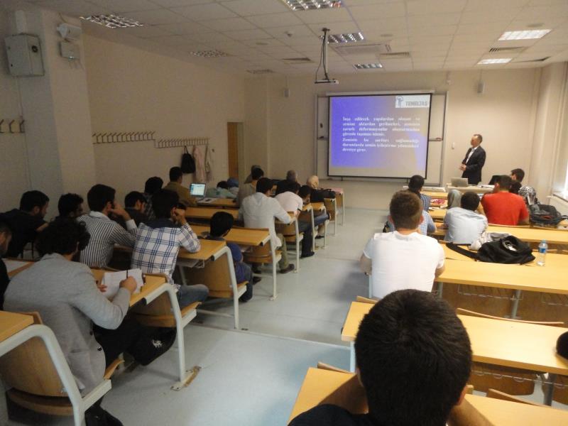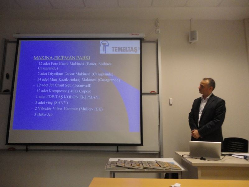 15 Mayıs 2015 Cuma günü, Mühendislik Fakültesi bünyesinde verilen Girişimcilik ve İnovasyon dersi kapsamında Üniversitemize konuk olarak katılan Temeltaş İnşaat Sanayi ve Ticaret AŞ Proje Müdürü Muhammet Rüştü ÖZCAN, yurtiçi ve yurtdışında yer aldıkları önemli projeler hakkında bilgiler aktardı. Projelerdeki zeminler ve zeminlere göre uyguladıkları teknolojileri tanıtarak öğrencilere uygulamalar hakkında geniş ölçekli bilgiler verdi. Mühendislik Fakültesi Dekanı Prof. Dr. Fevzi YILMAZ, İnşaat Mühendisliği Bölüm Başkanı Prof. İbrahim EKİZ, İnşaat Mühendisliği Öğretim Üyesi Yrd. Doç. Dr. Ayşe Bengü SÜNBÜL, Araştırma Görevlileri ve çok sayıda öğrencinin katıldığı seminerde ÖZCAN, rol aldıkları 1. etabı tamamlanmış, 2. ve 3. etabın da çalışmaları süren ve dünyada birçok ilke imza atan MARMARAY projesini detaylı şekilde anlattı. Genç mühendislere İnşaat sektörünün geldiği son teknolojileri aktaran ÖZCAN’a ve birlikte geldiği Temeltaş AŞ şirket yöneticilerine hediye takdim edildi.