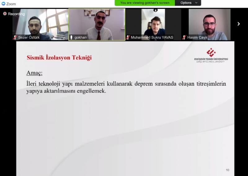 Deprem Haftası içerisinde, Yapı ve İnşaat Kulübü öğrencilerimizin düzenlediği, 5 Mart 2021 tarihindeki İnşaat Mühendisliği Bölümü etkinliği bünyesinde, Eskişehir Teknik Üniversitesi’nden değerli araştırmacı ve öğretim üyesi Prof. Dr. Gökhan Özdemir ile çevrim içi bir seminer gerçekleştirilmiştir. Etkinlikte, depremlerde yapıların kesintisiz kullanımının ve hasar görmemesinin sağlanması için kullanılan, ülkemizde de kullanımı giderek yaygınlaşan sismik izolatörler ve bu sistemlerin test süreçleri üzerine bilgiler edinilmiştir. Öğrencilerimizin çok memnun kaldığı seminer, katılımcıların sorularının cevaplandırılması ile son bulmuştur.